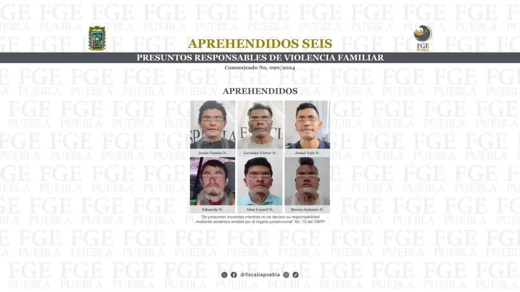 Por hechos distintos, la Fiscalía General del Estado de Puebla dio cumplimiento a seis órdenes de aprehensión contra Jesús Tomás N., Germán Víctor N., Josué Yair N., Eduardo N., Alan Leonel N. y Marco Antonio N., presuntos responsables del delito de violencia familiar.