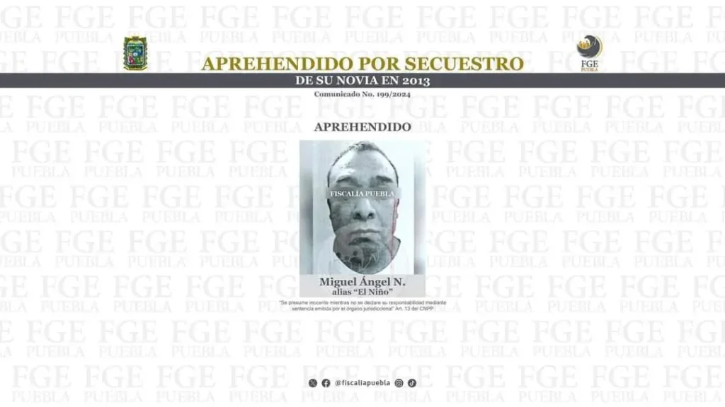 La Fiscalía General del Estado de Puebla ejecutó una orden de aprehensión contra Miguel Ángel N., alias “El Niño”, por su responsabilidad en la privación de la libertad de una mujer en 2013.