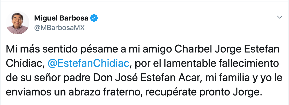 El gobernador electo Miguel Barbosa, expresó sus condolencias ante la muerte del padre del secretario de Finanzas, Jorge Estefan Chidiac.