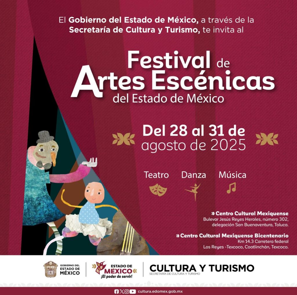 El Gobierno del Estado de México invita a disfrutar del Festival de Artes Escénicas, que se llevará a cabo del jueves 28 al domingo 31 de agosto en el Centro Cultural Mexiquense, en Toluca, y el Centro Cultural Mexiquense Bicentenario, en Texcoco.