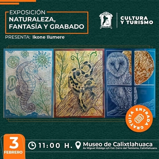 Para los amantes de la historia y del arte, el Museo Arqueológico de Calixtlahuaca recibirá a chicos y grandes con su basta muestra a la que se suma la exposición gráfica “Naturaleza, fantasía y grabado”, del artista Ikone Ilumere, cuya inauguración será a las 11:00 horas.