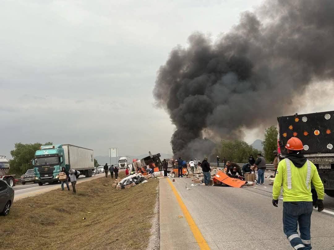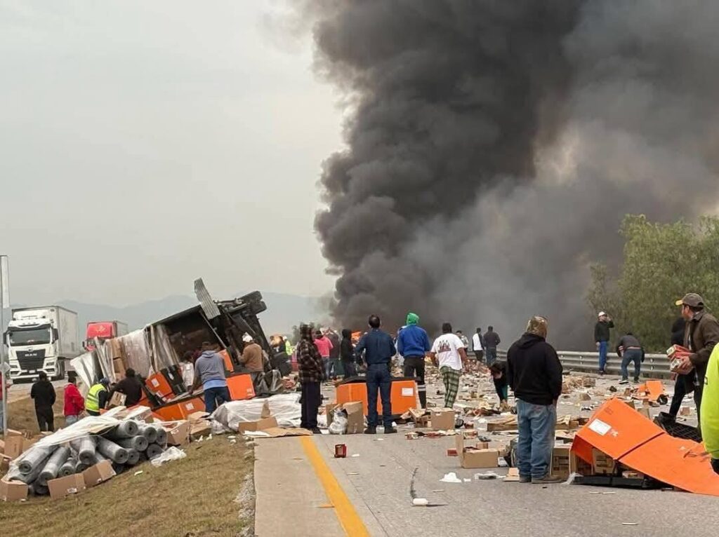 Una de las unidades involucradas es un tráiler tipo plataforma cargado con dos contenedores, mientras que la unidad que provocó el accidente y que terminó sobre el camellón es un tráiler con caja seca.