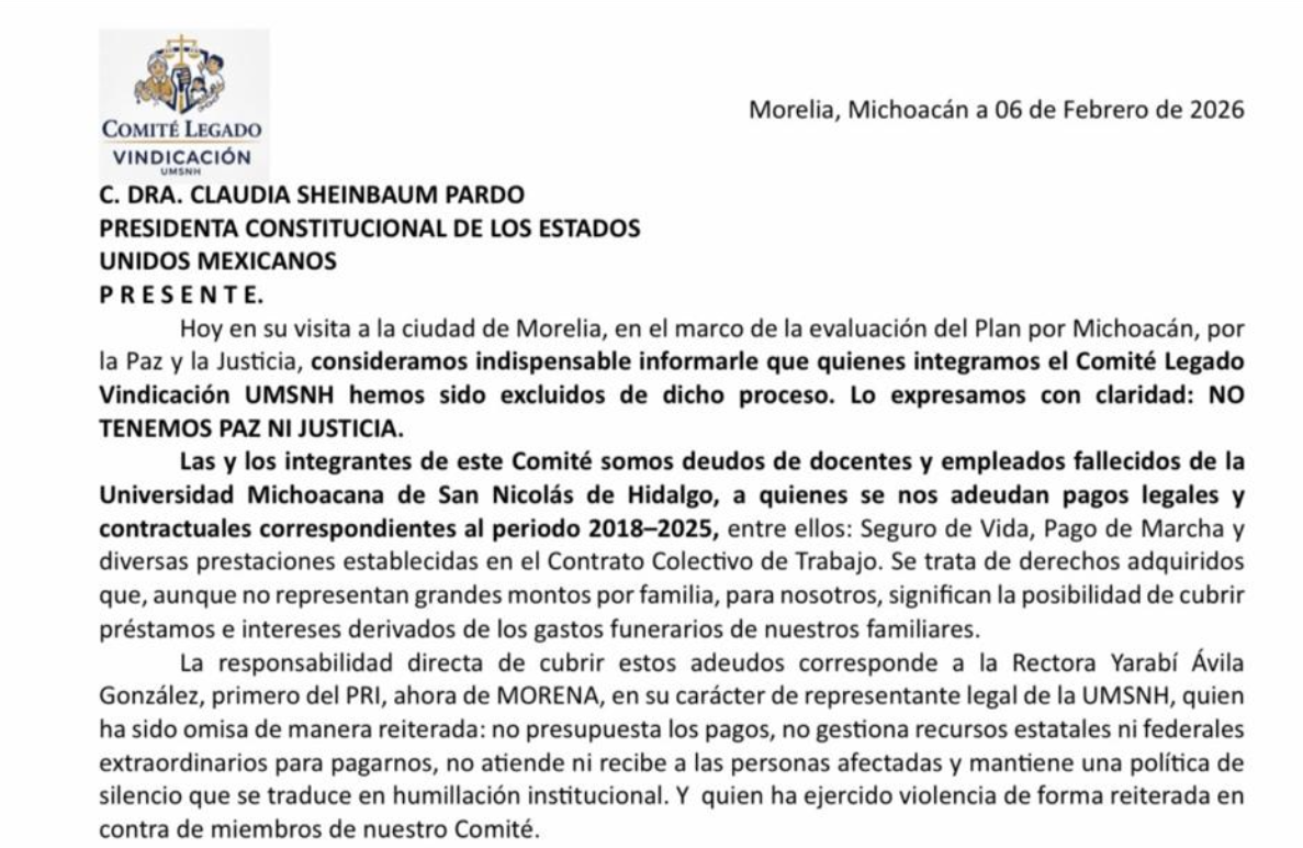 Trabajadoras y trabajadores del Comité Legado Vindicación de la Universidad Michoacana de San Nicolás de Hidalgo (UMSNH), en voz de su representante Alba Sovietina Estrada Cárdenas, denunciaron que no se les están pagando una serie de derechos contractuales que tienen que ver con seguros de vida, pago de marchas y otras prestaciones que están contenidas en el Contrato Colectivo de Trabajo (CCT).