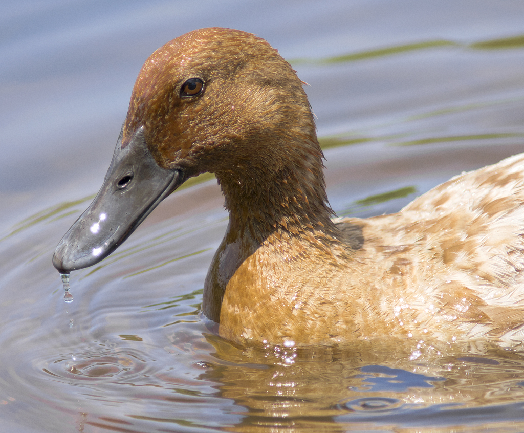 Por su parte, los patos domésticos, descendientes del ánade real o del pato criollo, son más grandes y pesados (entre 3 y 4 kg o más, según la raza). A menudo han perdido la capacidad de vuelo debido a su peso y a la crianza selectiva. Muestran una amplia variedad de colores —blanco, negro o pardo— y suelen ser más tranquilos, dóciles y no migratorios.