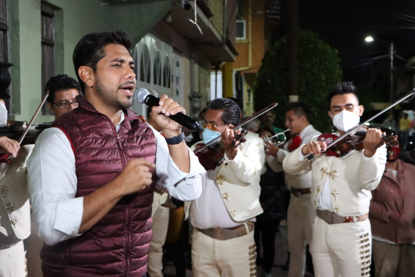El candidato morenista llevó la primera serenata de la noche a su mamá, doña Vicky, interpretando además de las mañanitas, cielo rojo, señora, hermoso cariño, cielito lindo, entre otras canciones, que deleitaron no solo a su mamá y hermanas sino a sus vecinas.