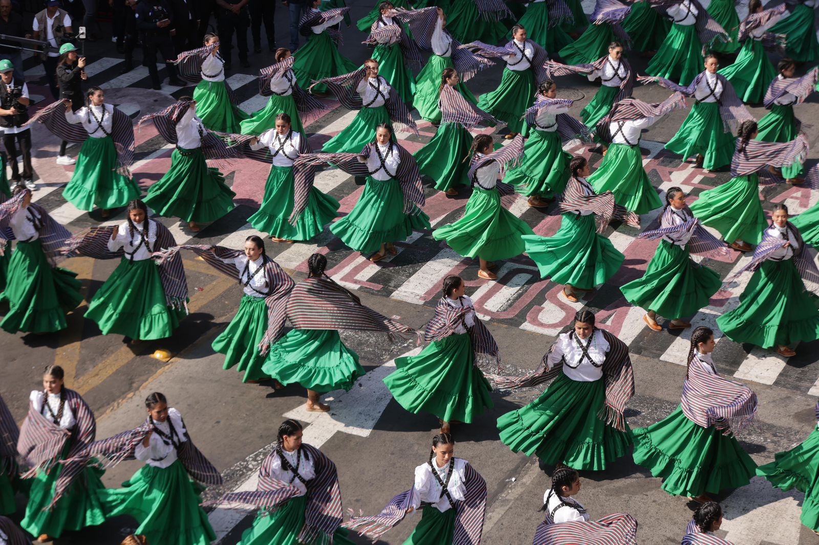 Desde el balcón de Palacio de Gobierno, el mandatario observó el paso de 2 mil 580 participantes por la avenida Madero, entre estudiantes de educación media superior y superior, trabajadores estatales y municipales, integrantes de asociaciones deportivas, militares y guardias nacionales, entre otros participantes.