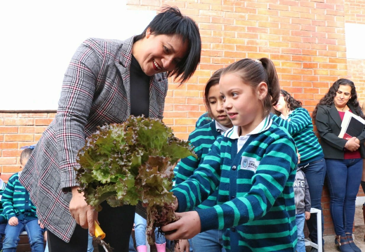 Liliana Coronado quien acompañó a los niños de preescolar y primaria a recolectar lo sembrado. tambien aprovecho para reconocer al personal de la Secretaría de Medio Ambiente y Sustentabilidad, encabezado por Clara Martínez Gallardo por estas iniciativas que cambian hábitos y promueven valores.