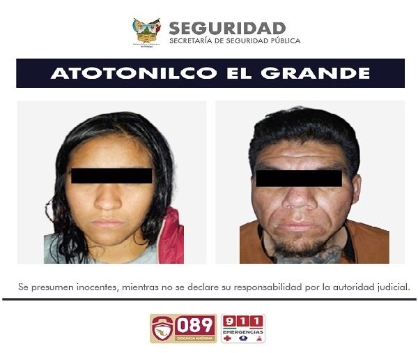 En tanto, en el municipio de Atotonilco El Grande, agentes estatales lograron la detención de un hombre y una mujer identificados con las iniciales R. G. B., alias “El Pecas”; y D. A. S. N., a quienes se les aseguraron mil 667 dosis de hierba seca con características de marihuana, 210 dosis de droga sintética “cristal”, dinero en efectivo, equipo de radiocomunicación y tecnológico.