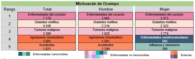 En el estado de Michoacán las gráficas muestran que las cinco principales causas de muerte fueron por enfermedades del corazón, diabetes mellitus, tumores malignos, agresiones (homicidios) y accidentes como se muestra en la siguiente gráfica: