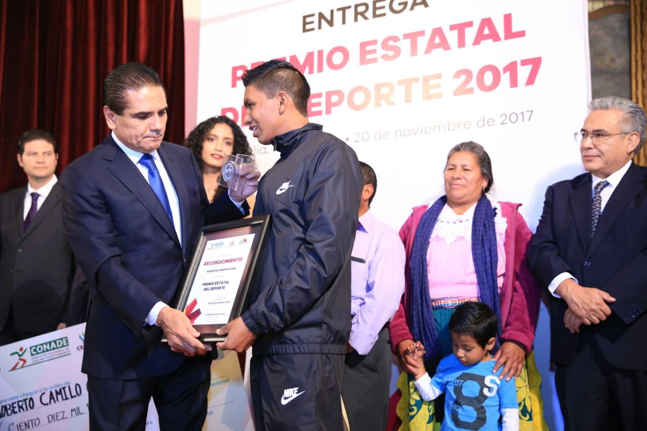 El Gobernador Constitucional Silvano Aureoles Conejo presidió esta mañana la entrega del Premio Estatal del Deporte 2017, al destacado deportista en la disciplina de canotaje Rigoberto Camilo Cortés, a quien reconoció su amplia trayectoria deportiva, a sus apenas 18 años de edad.