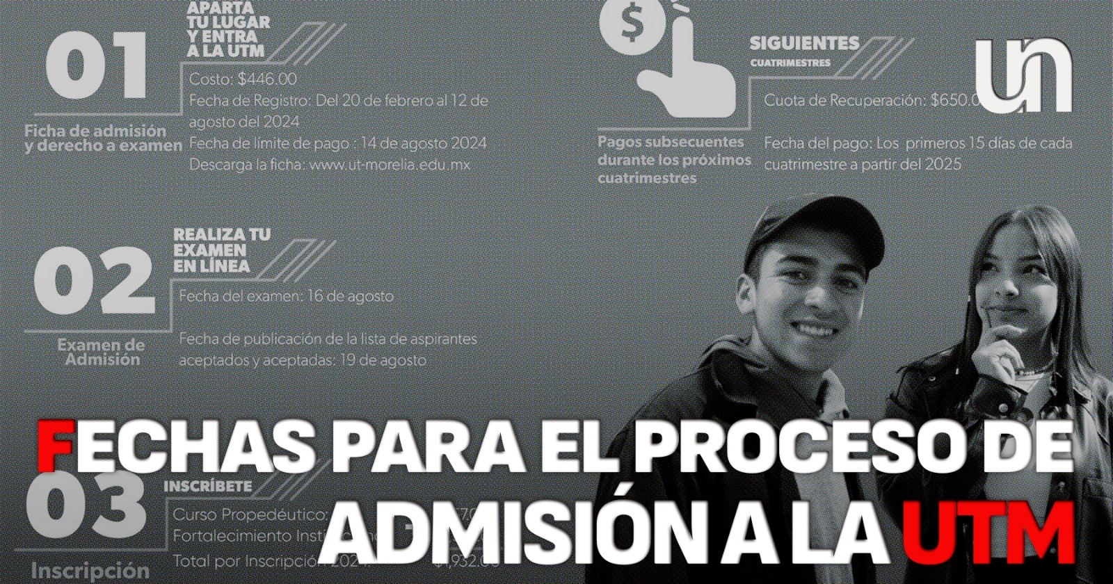 La Universidad Tecnológica de Morelia (UTM) anuncia que el proceso de solicitud de admisión se encuentra disponible para las y los interesados en unirse a su comunidad académica. El trámite podrá realizarse hasta el 12 de agosto y las clases darán inicio en septiembre de 2024.