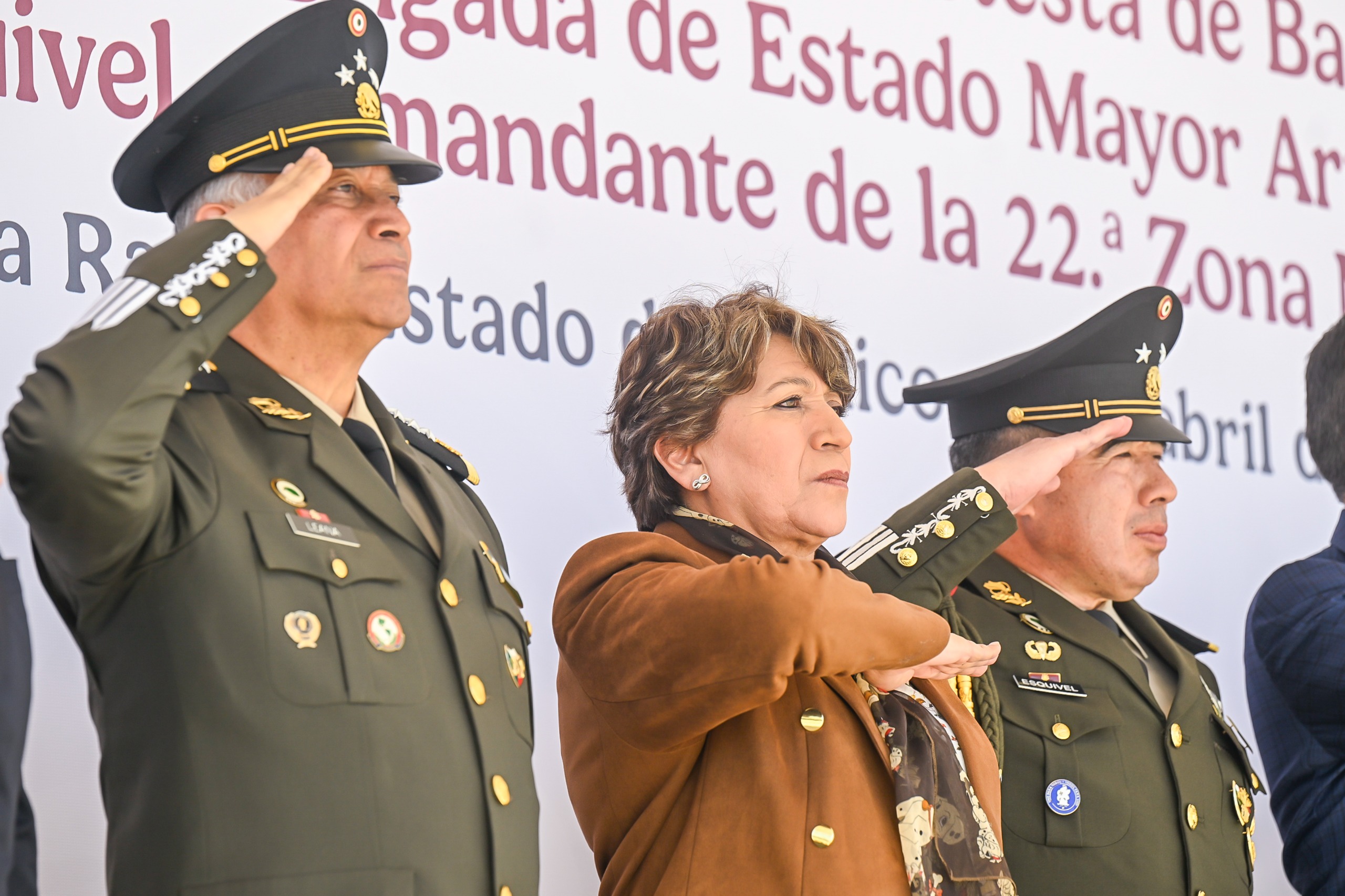 La Gobernadora Delfina Gómez Álvarez encabezó la ceremonia de toma de posesión del cargo y protesta de Bandera del General de Brigada de Estado Mayor, Armando López Esquivel, como Comandante de la 22/a Zona Militar con sede en Santa María Rayón, Estado de México.
