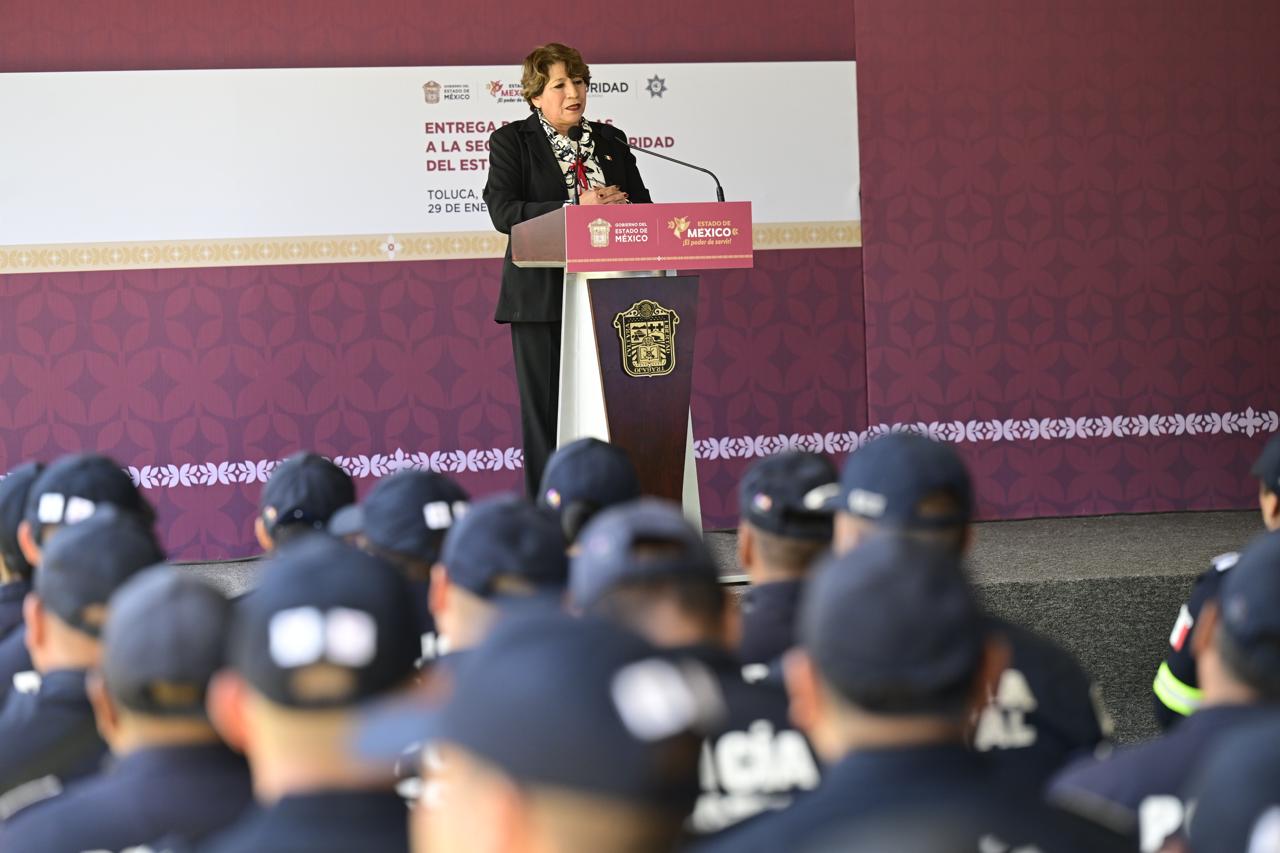 Delfina Gómez Álvarez entrega unidades equipadas con tecnología avanzada y anuncia mejoras salariales para policías