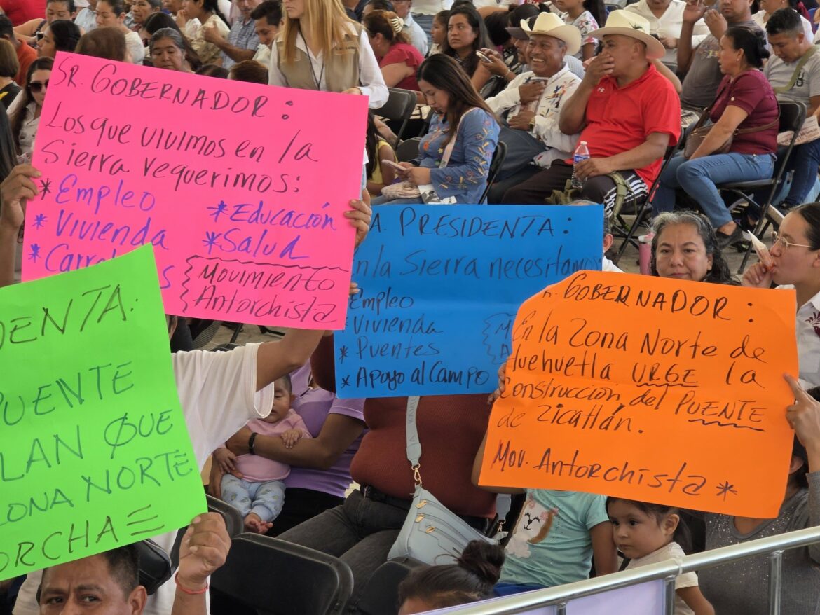 Previo a la llegada de la Presidenta de México, Claudia Sheinbaum Pardo, a Tenango de Doria, varias personas exhibieron cartulinas solicitando acelerar los trabajos de rehabilitación de infraestructura social y vialidades afectadas por las torrenciales lluvias registradas en la Sierra Otomí Tepehua del Estado de Hidalgo, en octubre del año pasado.