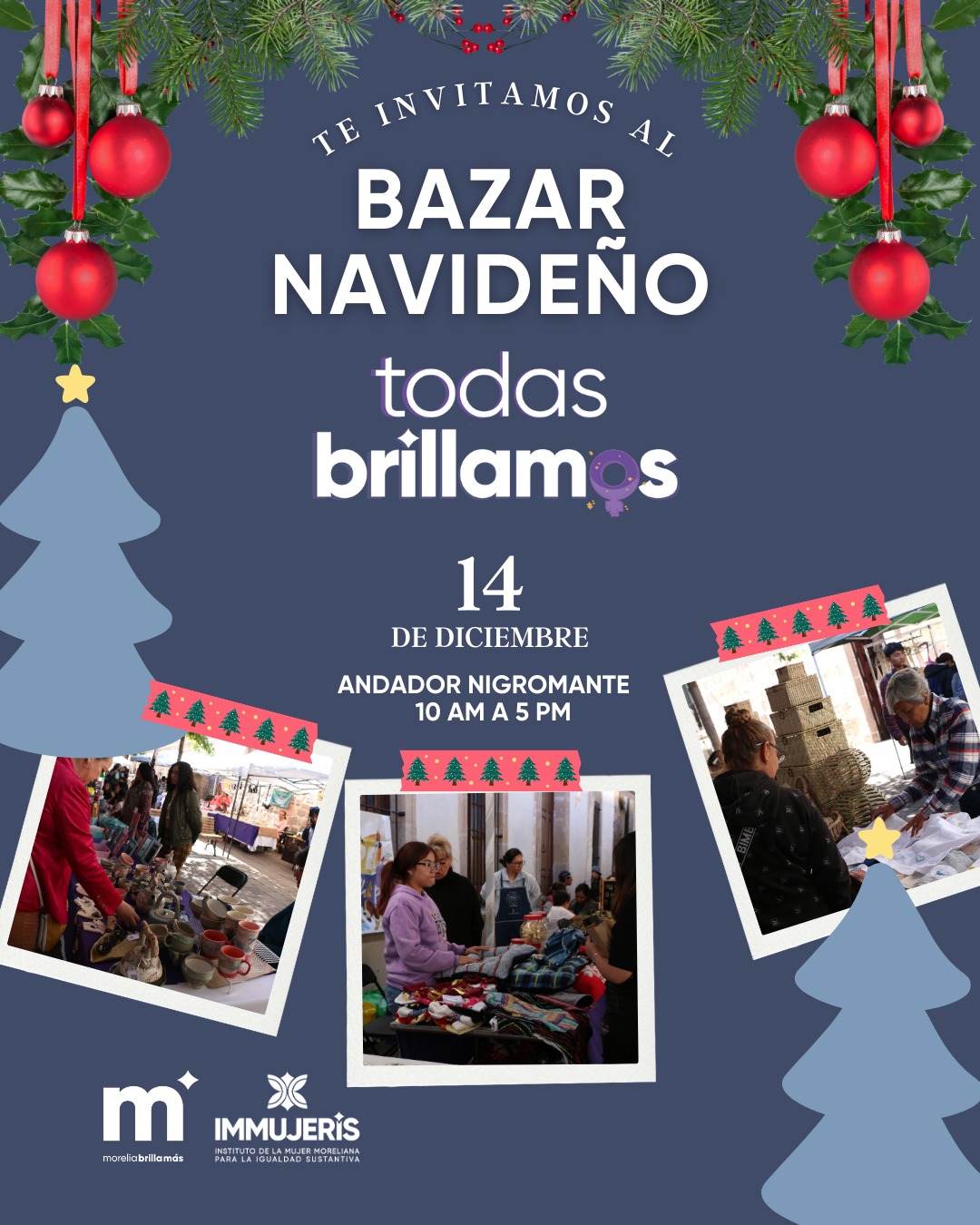 Morelia, Michoacán; 11 de diciembre de 2024. – Como parte de las estrategias para fortalecer el empoderamiento económico de las mujeres, el Gobierno de Morelia, a través del Instituto de la Mujer Moreliana para la Igualdad Sustantiva (IMMUJERIS), invita a la ciudadanía a asistir al Bazar Navideño “Todas Brillamos”.