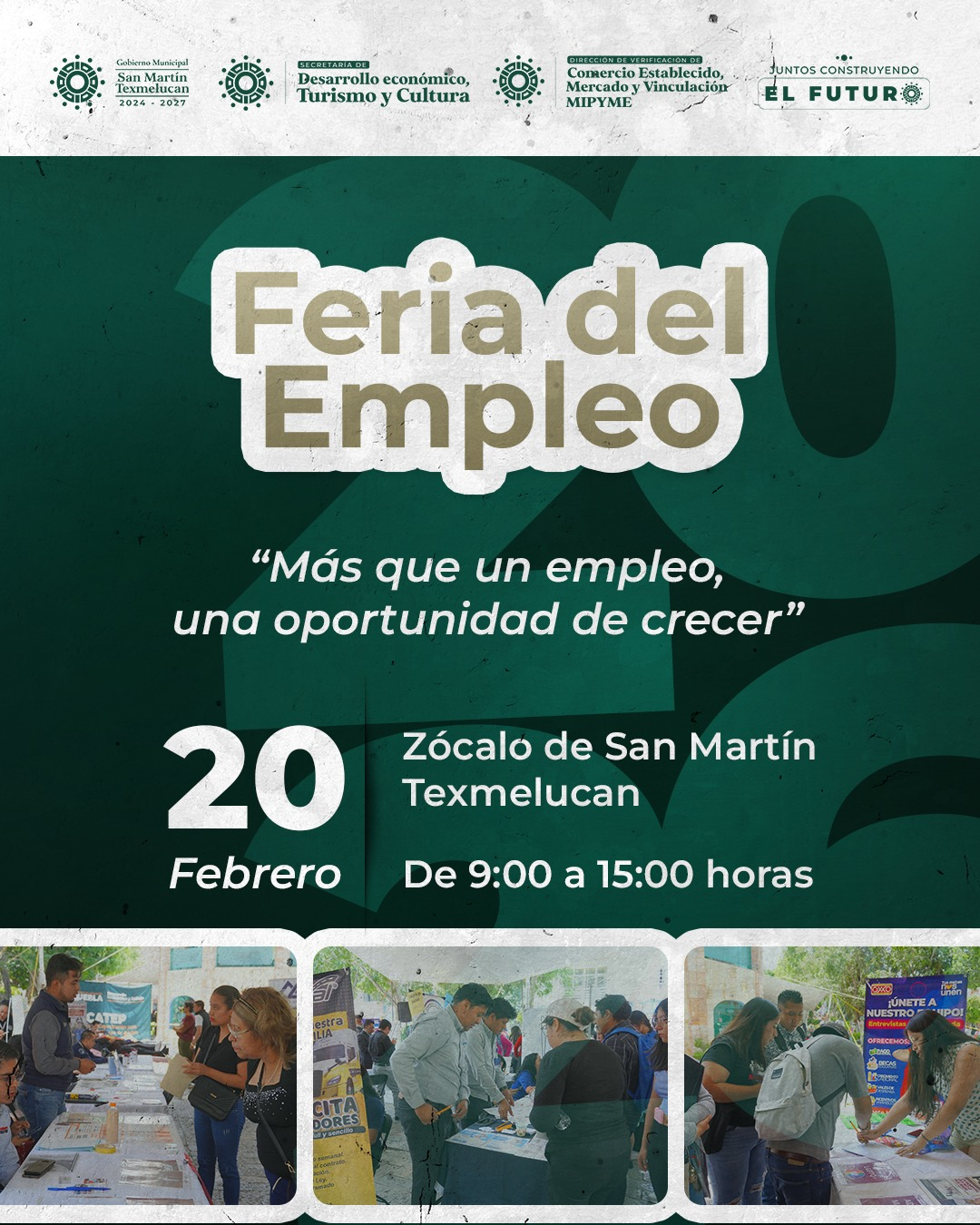 En respuesta al compromiso de fortalecer el empleo formal y brindar oportunidades laborales para los texmeluquenses, el Gobierno Municipal que preside Juan Manuel Alonso Ramírez, a través de la Secretaría de Desarrollo Económico, Turismo y Cultura y la Dirección de Verificación de Comercio Establecido, Mercados y Vinculación MIPyME, realizará la Feria del Empleo “Más que un empleo, una oportunidad de crecer”.