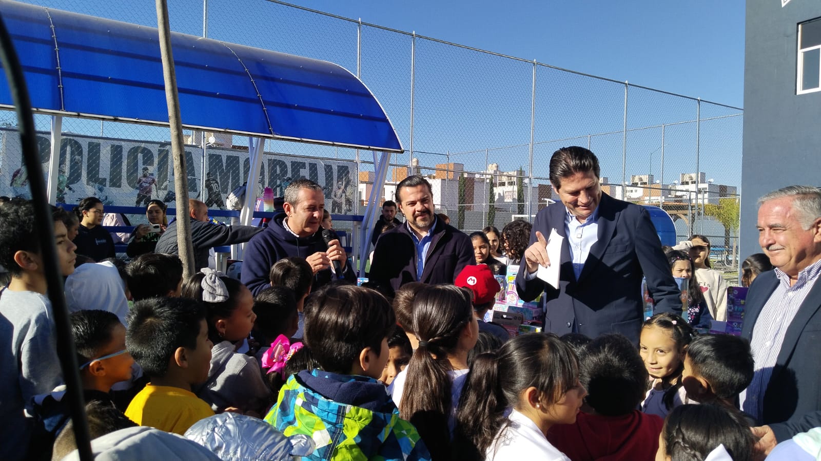 Desde una temprana hora en la mañana, instaron a los pequeños a realizar actividades físicas y de activación, esperando a que arribara el alcalde Alfonso Martínez Alcázar, y el comisionado de Policía Morelia, Alejandro González Cussi, para comenzar con la repartición de balones, audifonos, muñecas, y demás sets de juguete.