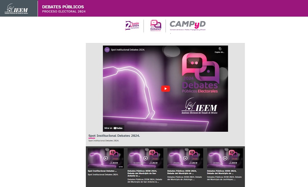 Todos los videos de los Debates Públicos Electorales 2024 están disponibles en https://sistemaselec.ieem.org.mx/debates-publicos-2024/.