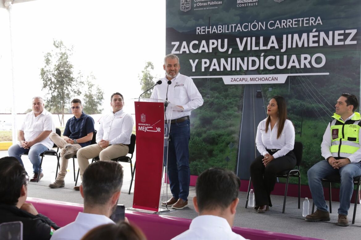 Zacapu, Michoacán, 19 de octubre de 2024.- Al inaugurar los trabajos de rehabilitación de la carretera Zacapu-Villa Jiménez-Panindícuaro, con una inversión de 69.7 millones pesos del esquema de obras multianuales, que no generan deuda, el gobernador Alfredo Ramírez Bedolla destacó la importancia de contar con vialidades en óptimas condiciones.