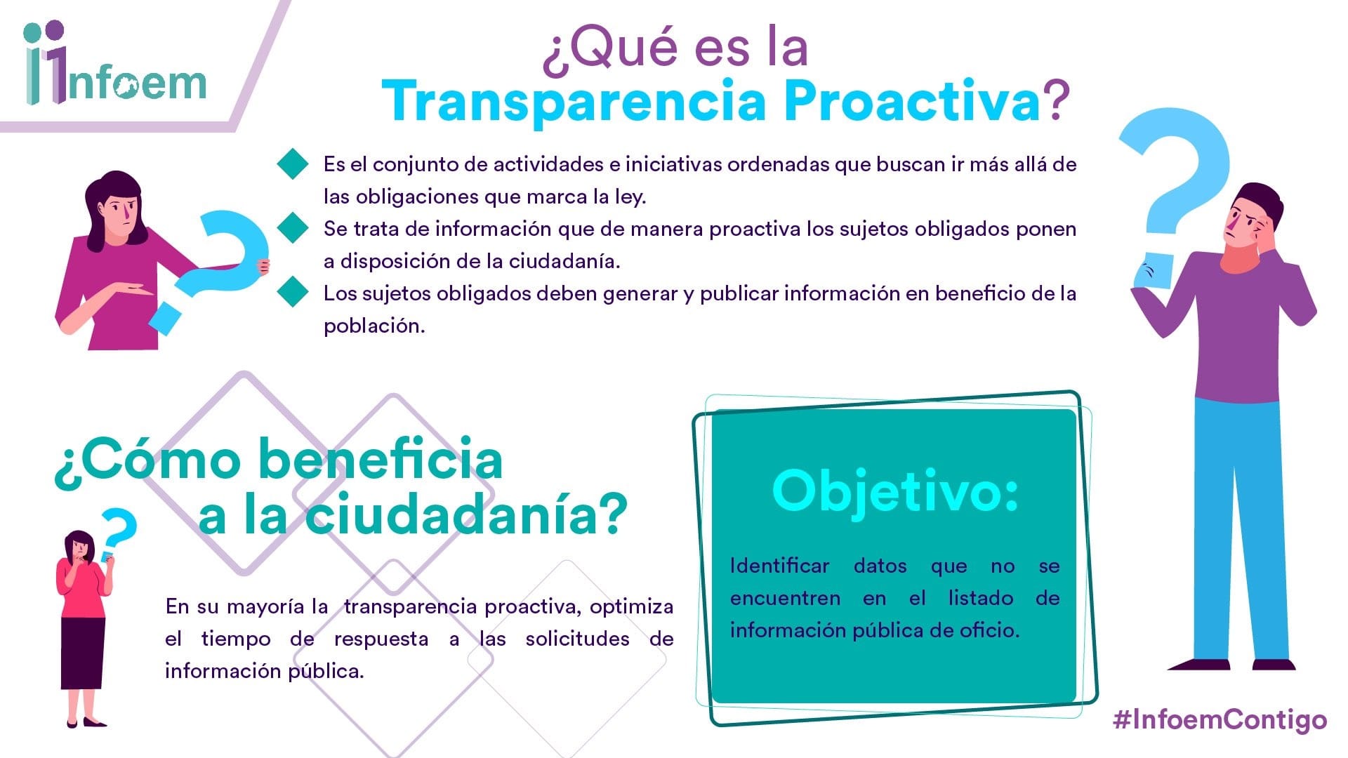 La Transparencia Proactiva busca identificar información que no se encuentre en el listado de información que deba ser publicada de manera obligatoria en los portales de transparencia de los sujetos obligados; pero que al darla a conocer a la ciudadanía, pueda dar respuesta a la demanda de información de la sociedad y promover su participación activa en la solución de problemas públicos; por lo que las instituciones públicas deben generar información que beneficie a un número importante de solicitantes.
