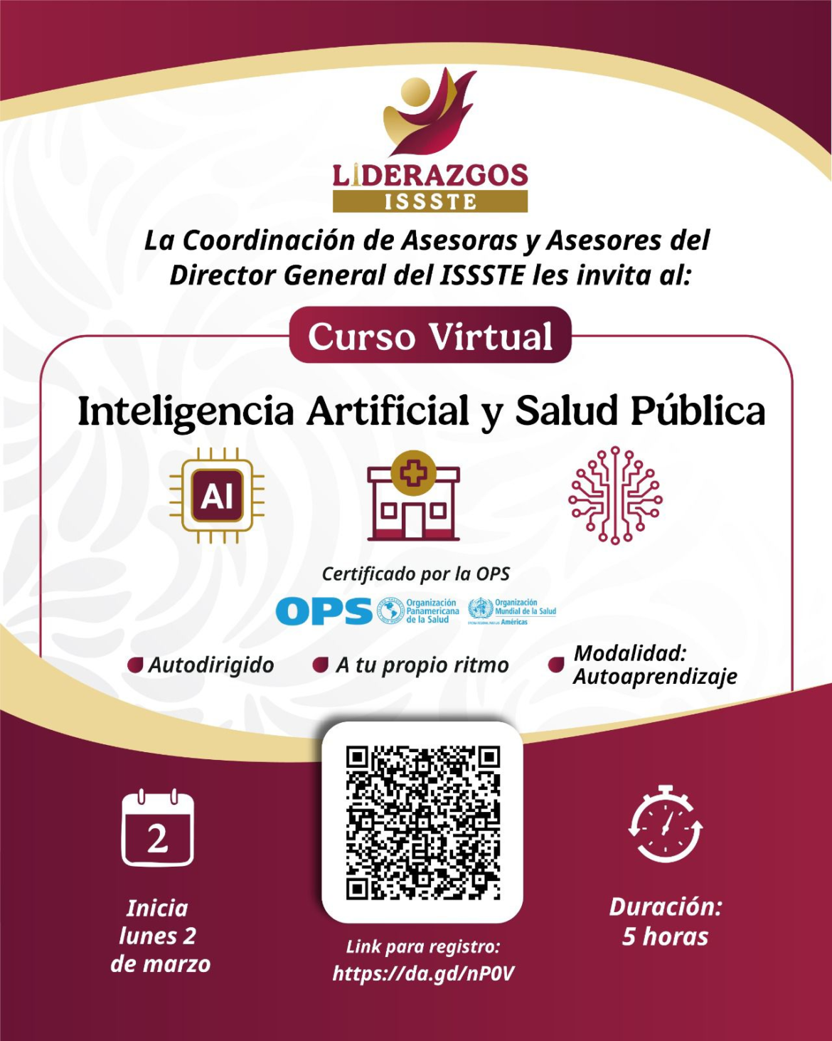 El Instituto de Seguridad y Servicios Sociales de los Trabajadores del Estado (ISSSTE), a través de la Coordinación de Asesoras y Asesores de la Dirección General, lanzó una invitación para participar en el curso virtual Inteligencia Artificial Salud Pública, certificado por la Organización Panamericana de la Salud (OPS).