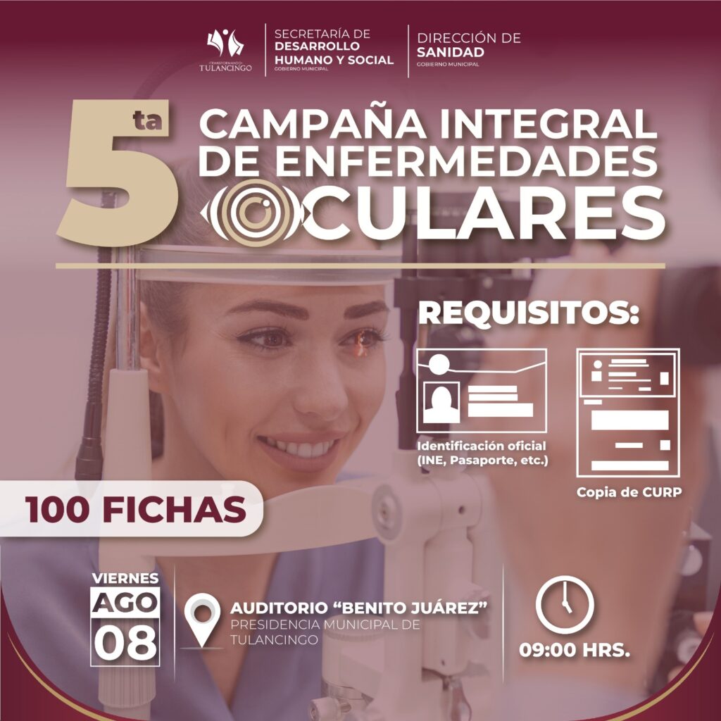 En virtud de que para el gobierno que encabeza la presidenta Lorena García Cázares la salud visual es una prioridad, ya hay fecha para la quinta campaña integral de enfermedades oculares a realizarse este 8 de agosto con la primera etapa consistente en un filtro selectivo a pacientes aptos para cirugía, con especialistas de la Clínica Oftalmológica Sala uno para corregir padecimientos como catarata, glaucoma y otras retinopatías.