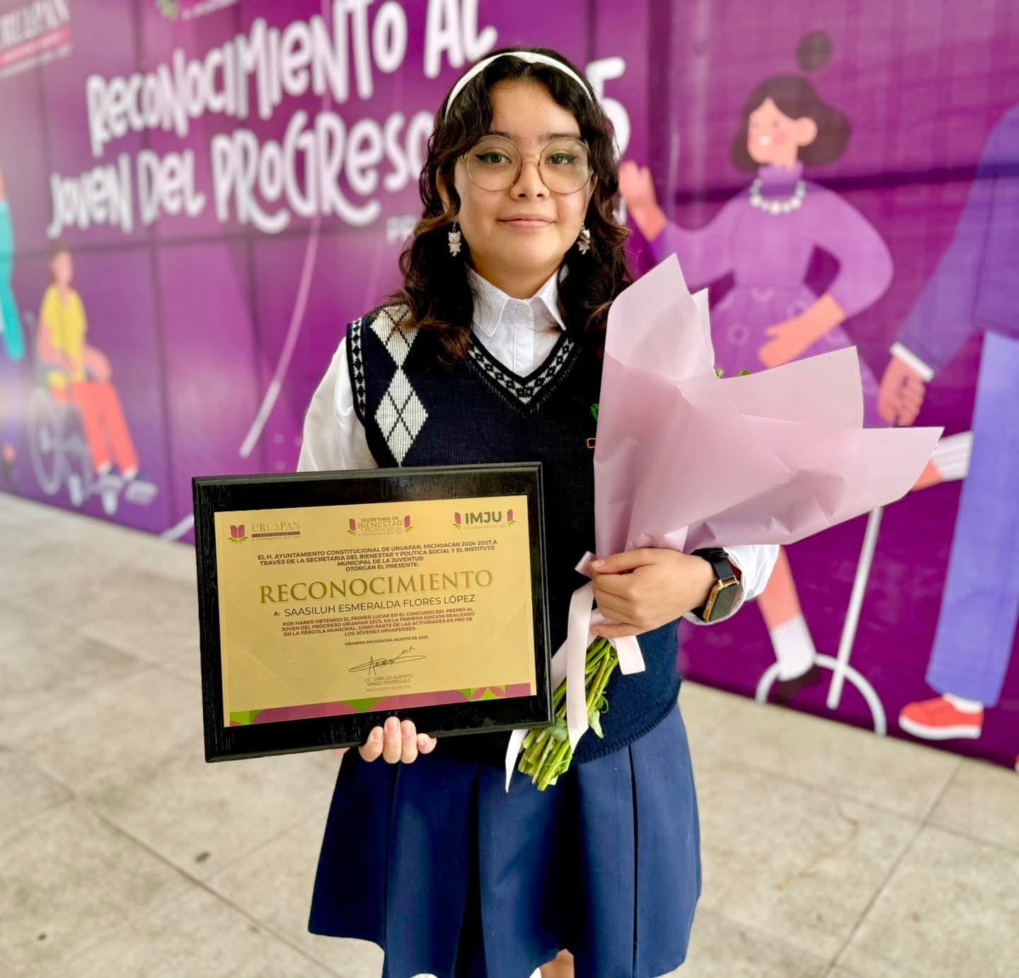 Saasiluh Esmeralda recibió el premio al Joven del Progreso en Uruapan por su un traductor purépecha-español.