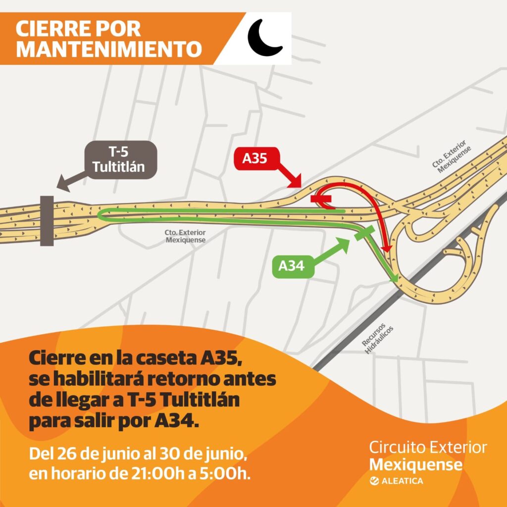 La Secretaría de Movilidad del Estado de México, dio a conocer que el Circuito Exterior Mexiquense se encontrará cerrado del 26 al 30 de junio en un horario de 21:00 a 5:00 horas debido a la instalación de un sistema anti evasión de pago en la caseta de cobro A35 de Tultitlán.
