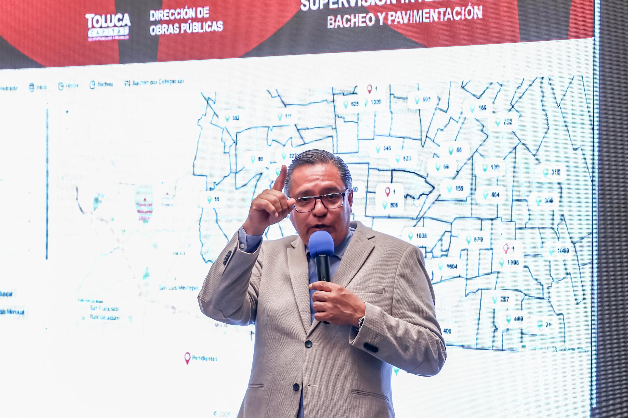 Durante la conferencia La Toluqueña, el Presidente Municipal explicó que derivado de que la carpeta asfáltica se encuentra en malas condiciones y se tenía un registro 180 mil baches sumados a los que se abren por la temporada de lluvias, el Gobierno municipal mantiene acciones permanentes para lograr que, en poco más de un año, se realice cerca del 45% de los trabajos que se llevaron a cabo en toda la pasada administración.