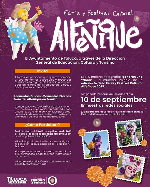 Para fortalecer la memoria colectiva y la identidad cultural, el Gobierno municipal invita a la población a compartir fotografías y recuerdos familiares y, con ello, ser uno de los 10 ganadores de la Nona, personaje insignia de la Feria y Festival Cultural Alfeñique 2025.