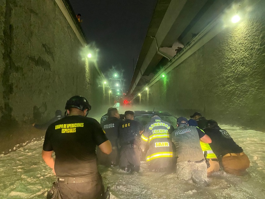 Uno de los puntos con mayores complicaciones fue el bajo puente de avenida Las Torres y Jesús Carranza, donde cuatro vehículos quedaron atrapados y ocho personas fueron auxiliadas por elementos de la Policía Municipal.