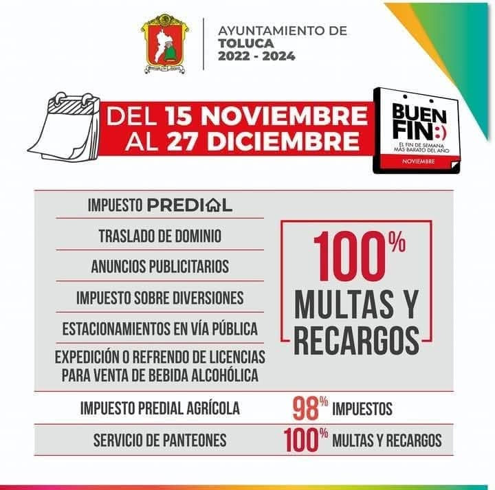 El gobierno municipal de Toluca invita a la ciudadanía a regularizar sus adeudos fiscales aprovechando las bonificaciones y descuentos vigentes como parte de la campaña Buen Fin 2024, diseñada para aliviar la carga económica de los hogares toluqueños.
