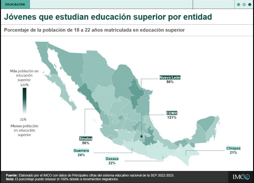 De acuerdo con el Instituto Mexicano para la Competitividad (IMCO), en 28 estados de nuestro país, más de la mitad de los jóvenes de 18 a 22 años no estudian una carrera; en la zona sur, en el estado de Chiapas solo el 21% de la población juvenil se encuentra inscrito a alguna institución de educación superior, Oaxaca supera con apenas 1% la cifra y Guerrero con un 4%, es decir, 24% de su población juvenil.