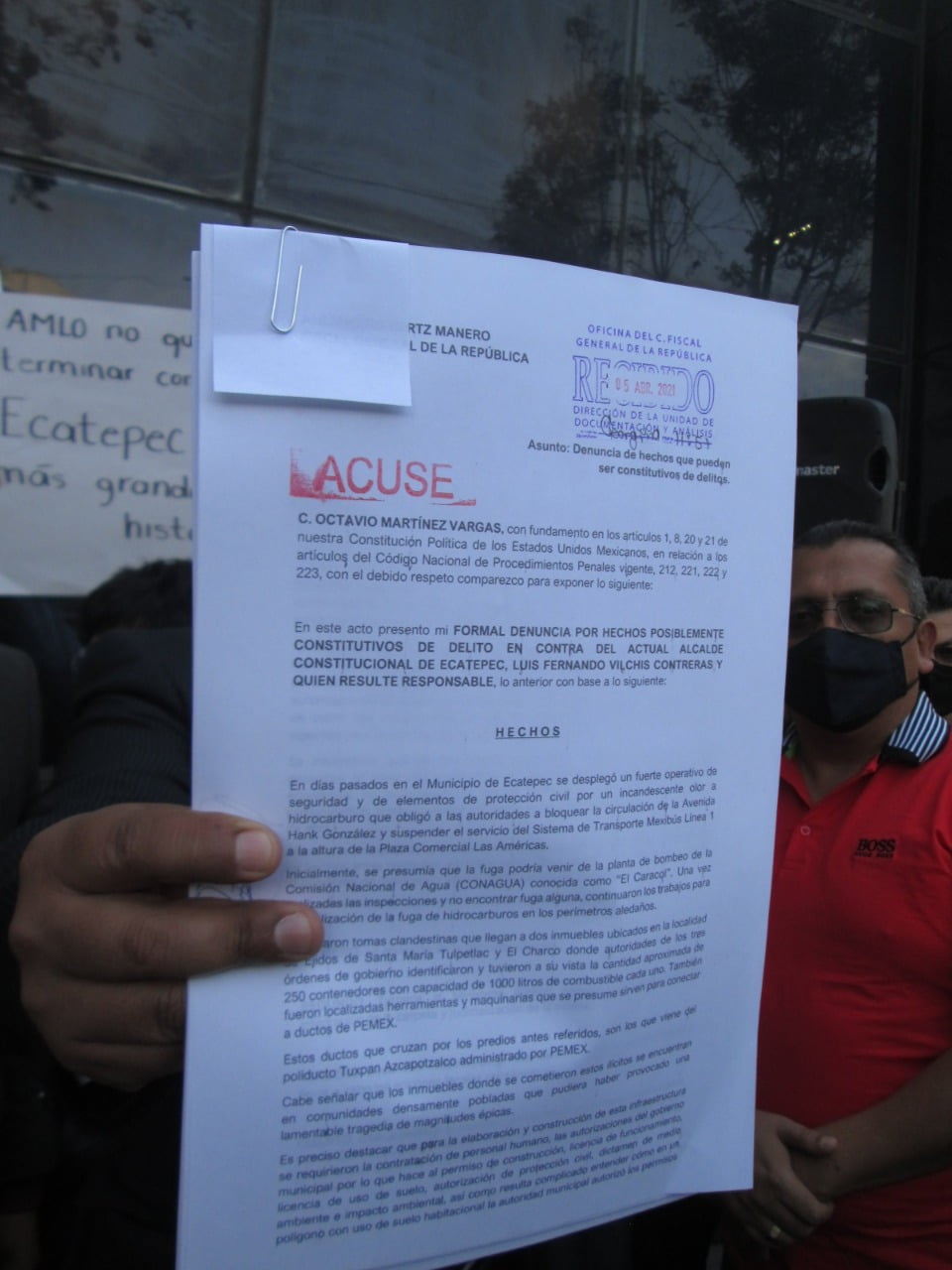 “Hoy presentamos formal denuncia en contra del presidente municipal de Ecatepec, Fernando Vilchis Contreras y de su administración por permitir el robo de combustible, denominado huachicoleo en cantidades industriales, poniendo en riesgo la vida de nuestros vecinos”, informó el Consejero Nacional del PRD, Octavio Martínez Vargas, al entregar el oficio en la Fiscalía General de la República en la Ciudad de México.