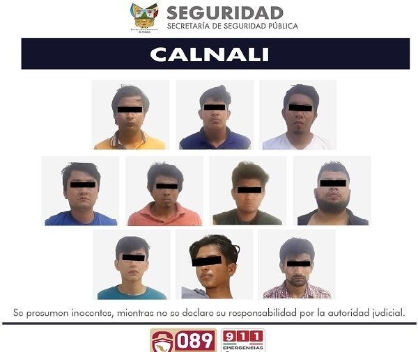 Calnali, Hidalgo.- En operación conjunta, agentes de la Secretaría de Seguridad Pública de Hidalgo (SSPH), y elementos de las policías de Calnali, Molango y Xochicoatlán, llevaron a cabo la detención de 10 integrantes de una banda delictiva presuntamente dedicada a la extorsión, al cobro de piso y secuestro en la huasteca hidalguense.
