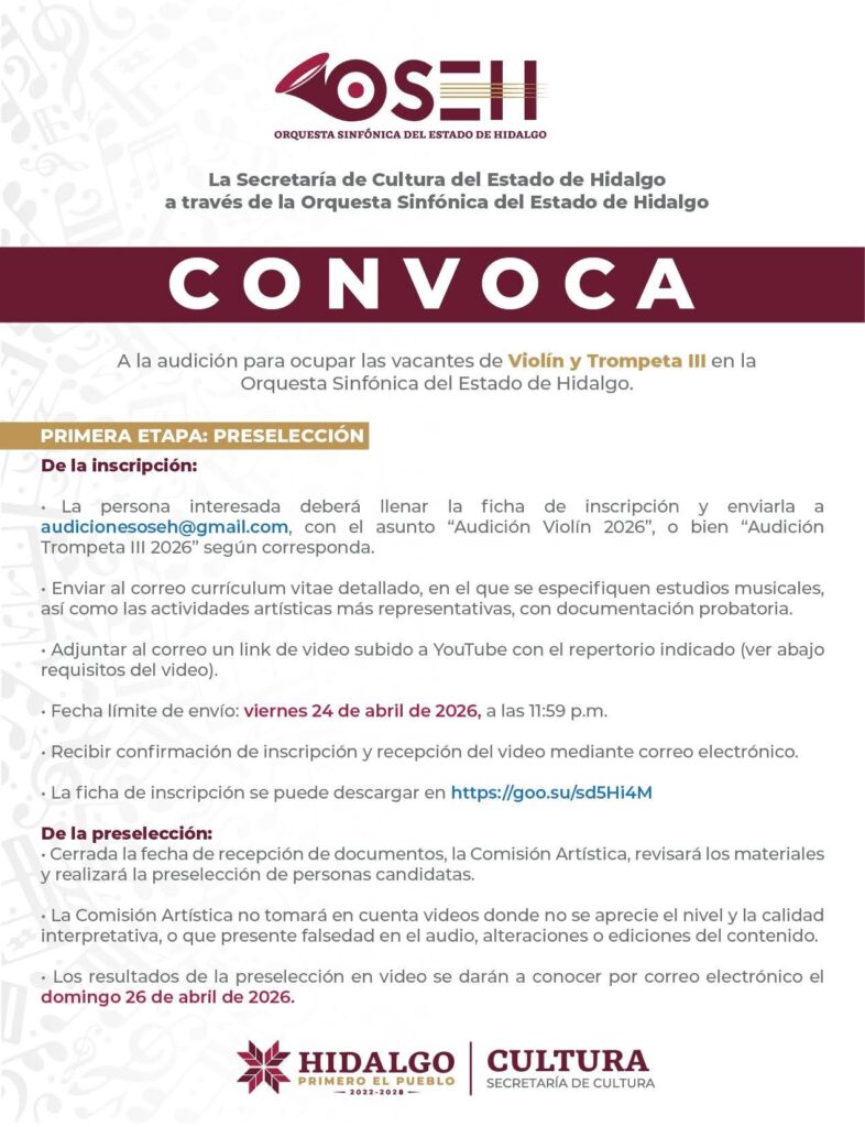 La Orquesta Sinfónica del Estado de Hidalgo (OSEH) abrió audiciones para incorporar nuevos perfiles a su agrupación, dirigidas a intérpretes de violín y trompeta III que busquen integrarse a un proyecto musical de alto nivel.