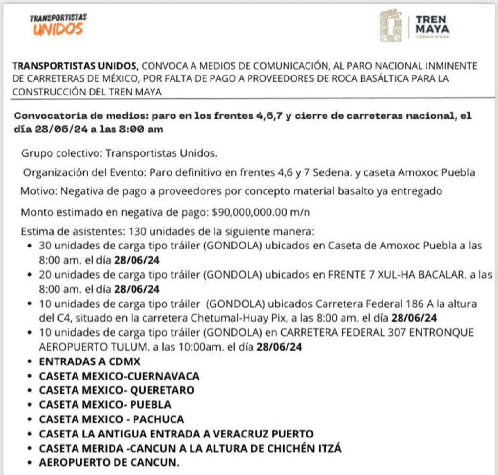 Ello para exigir el pago de aproximadamente 90 millones de pesos por el traslado de material para la construcción del Tren Maya, en el sureste del país.Se prevé que la autopista México-Pachuca estará bloqueada por la manifestación a partir de las ocho de la mañana, a la altura de la caseta de Ojo de Agua, en el Estado de México.Otras vías de acceso a la ciudad de México que se prevén con bloqueos son la autopista México-Cuernavaca, así como la México-Querétaro y la México-Puebla.En otros puntos del país se prevé el cierre de la caseta a la antigua entrada a Veracruz; la caseta Mérida-Cancún a la altura de Chichén-Itzá y la Carretera 186 A Chetumal-Huay, así como la carretera 307 en el entronque al Aeropuerto Tulum.Así como el acceso al aeropuerto de Cancún y el Frente 7 XUL-HA Bacalar.De acuerdo a un comunicado difundido por medio de redes sociales, los manifestantes usarán vehículos de carga para realizar los bloqueos carreteros.Se recomienda que en los casos donde sea posible, los automovilistas busquen vías alternas, o incluso puedan posponer sus traslados.