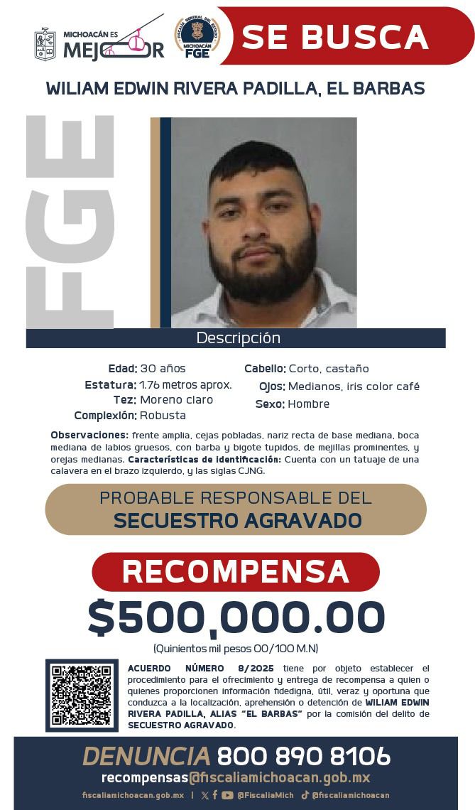 Como resultado de los trabajos de investigación que lleva a cabo la Fiscalía General del Estado de Michoacán (FGE), se logró establecer la presunta responsabilidad de William Edwin Rivera Padilla, el Barbas, en el delito de secuestro agravado, por lo que se ha emitido acuerdo de ofrecimiento de recompensa para quien proporcione información veraz y útil que conduzca a su detención.