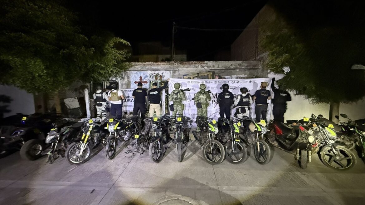 En una acción interinstitucional, elementos de las secretarías de Seguridad Pública (SSP) y de la Defensa Nacional (Defensa), así como la Guardia Nacional (GN), dieron acompañamiento a una orden de cateo que cumplimentó la Fiscalía General del Estado (FGE) en un inmueble en Jacona, donde se recuperaron 11 motocicletas robadas.