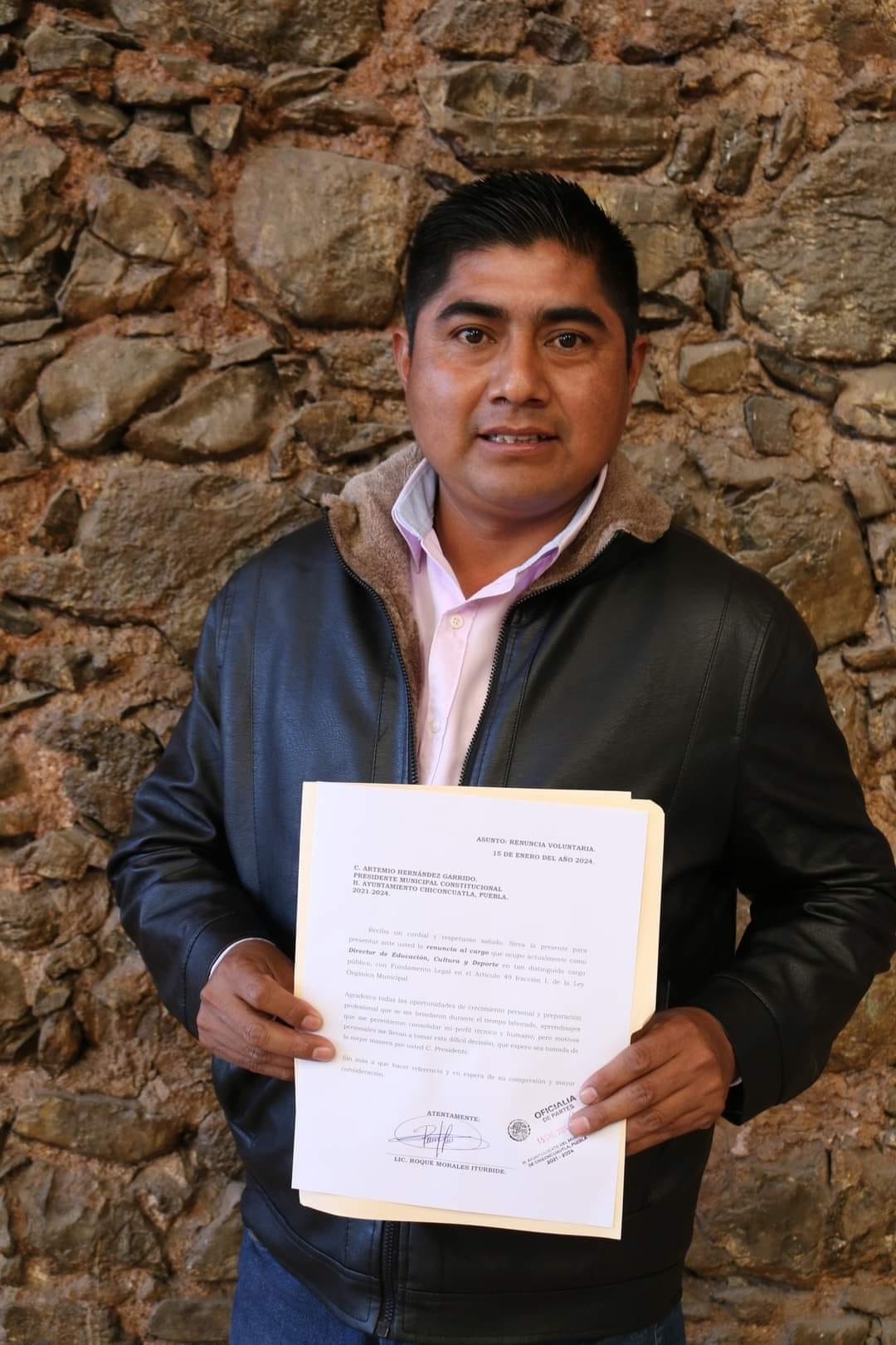 Roque Morales Iturbide quien fungía como director de Educación, Cultura y Deporte en el H. Ayuntamiento de Chiconcuautla, presentó formalmente su renuncia para buscar nuevos proyectos dentro de su carrera profesional y personal.