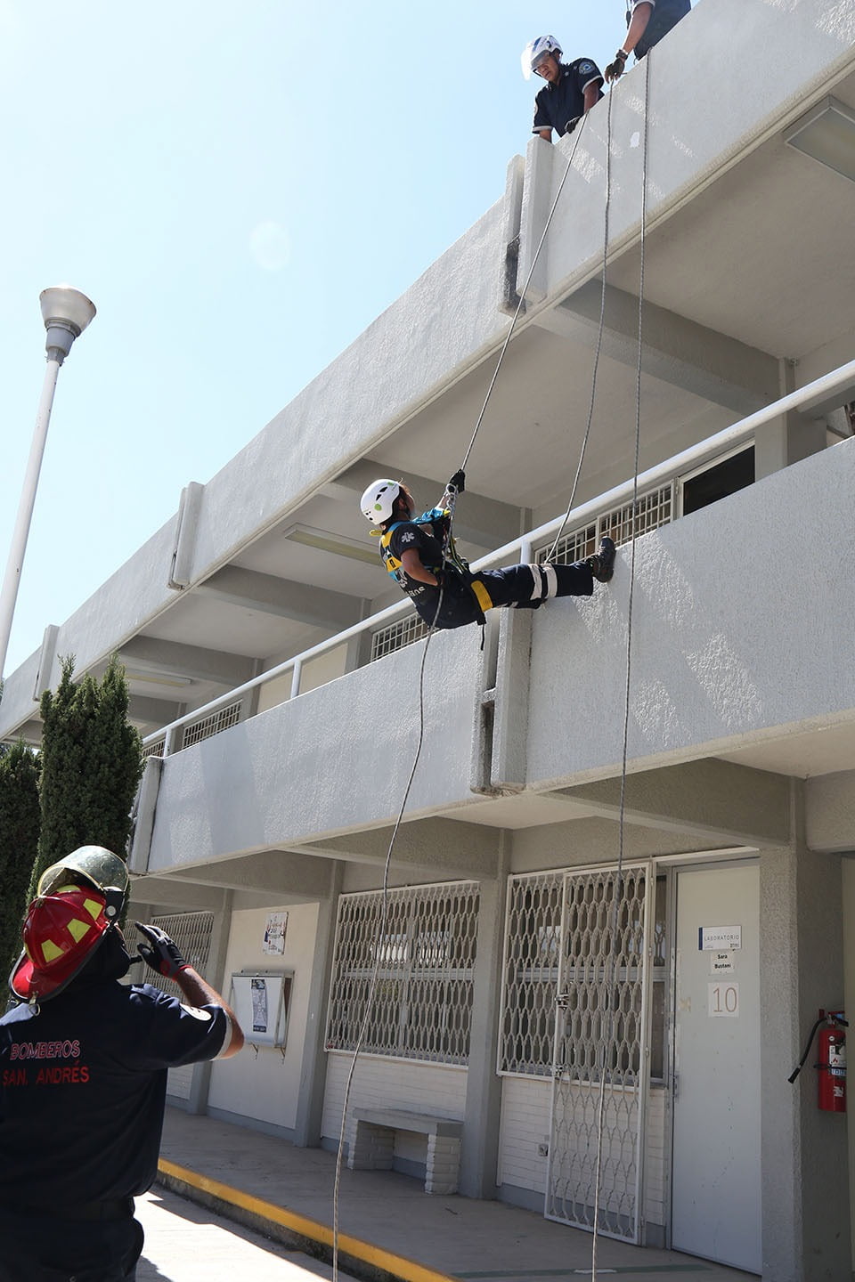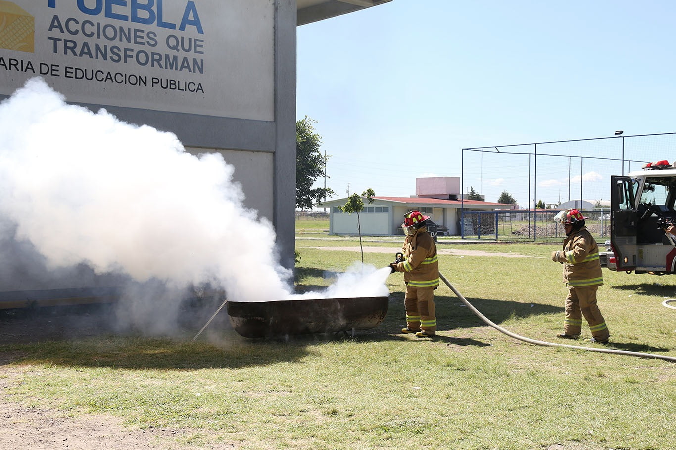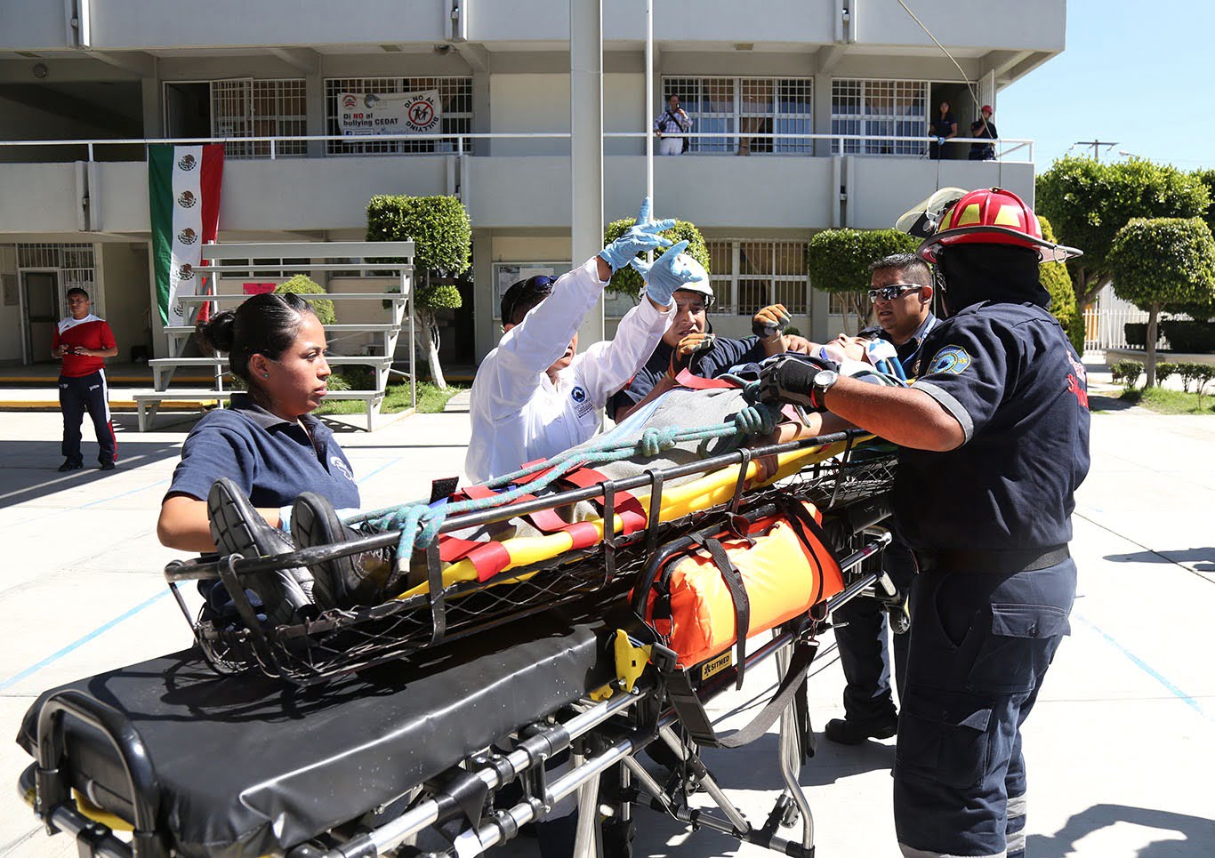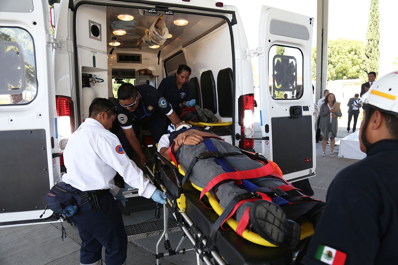 Ejecutan Simulacro por el Sismo de 1985 en San Andrés Cholula cuerpo de Protección Civil y Bomberos.