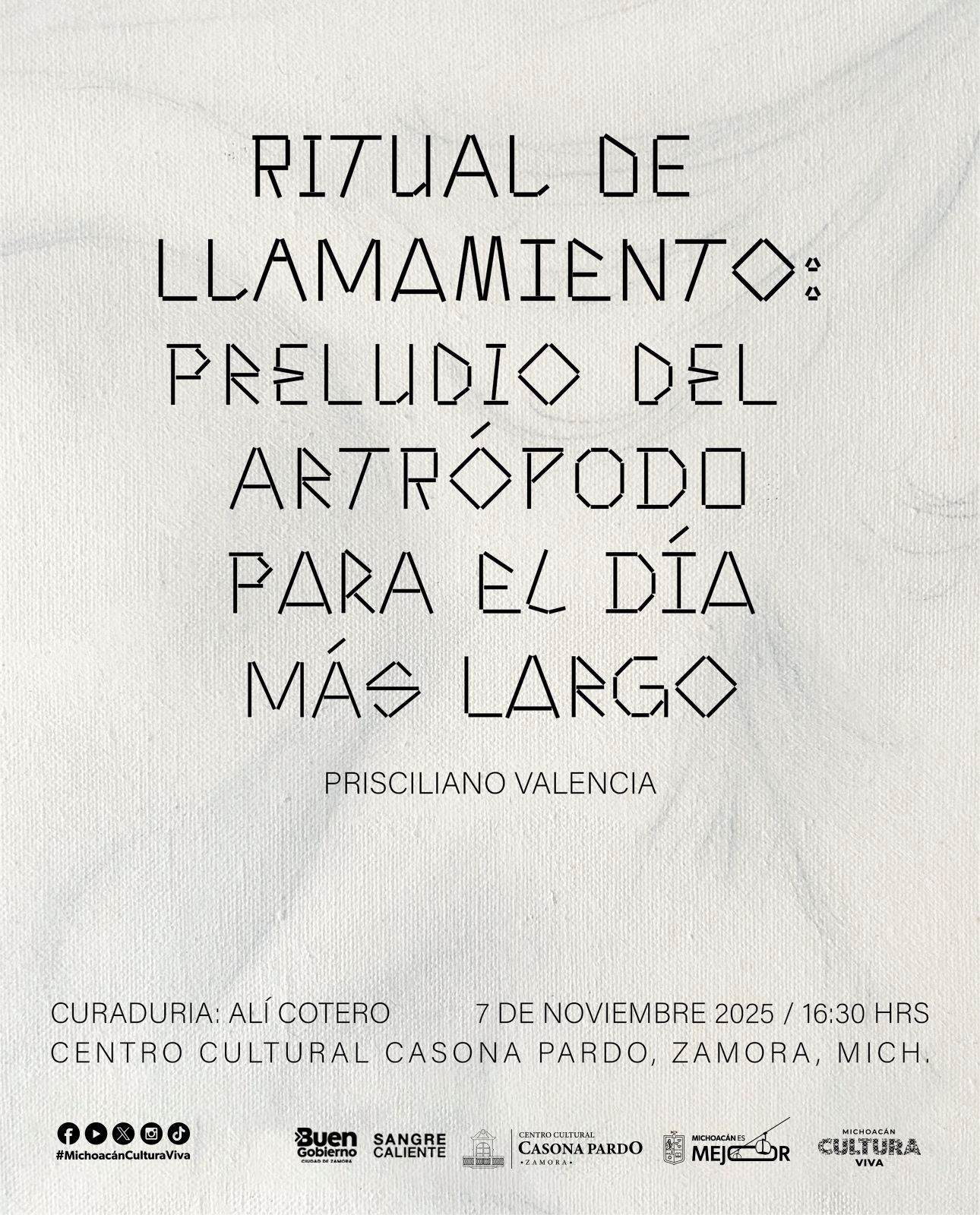 La Secretaría de Cultura de Michoacán (Secum) presentará la exposición “Ritual de llamamiento: preludio del artrópodo para el día más largo”, del artista michoacano Prisciliano Valencia, este viernes 7 de noviembre a las 16:30 horas en el Centro Cultural Casona Pardo, en Zamora, con entrada libre.