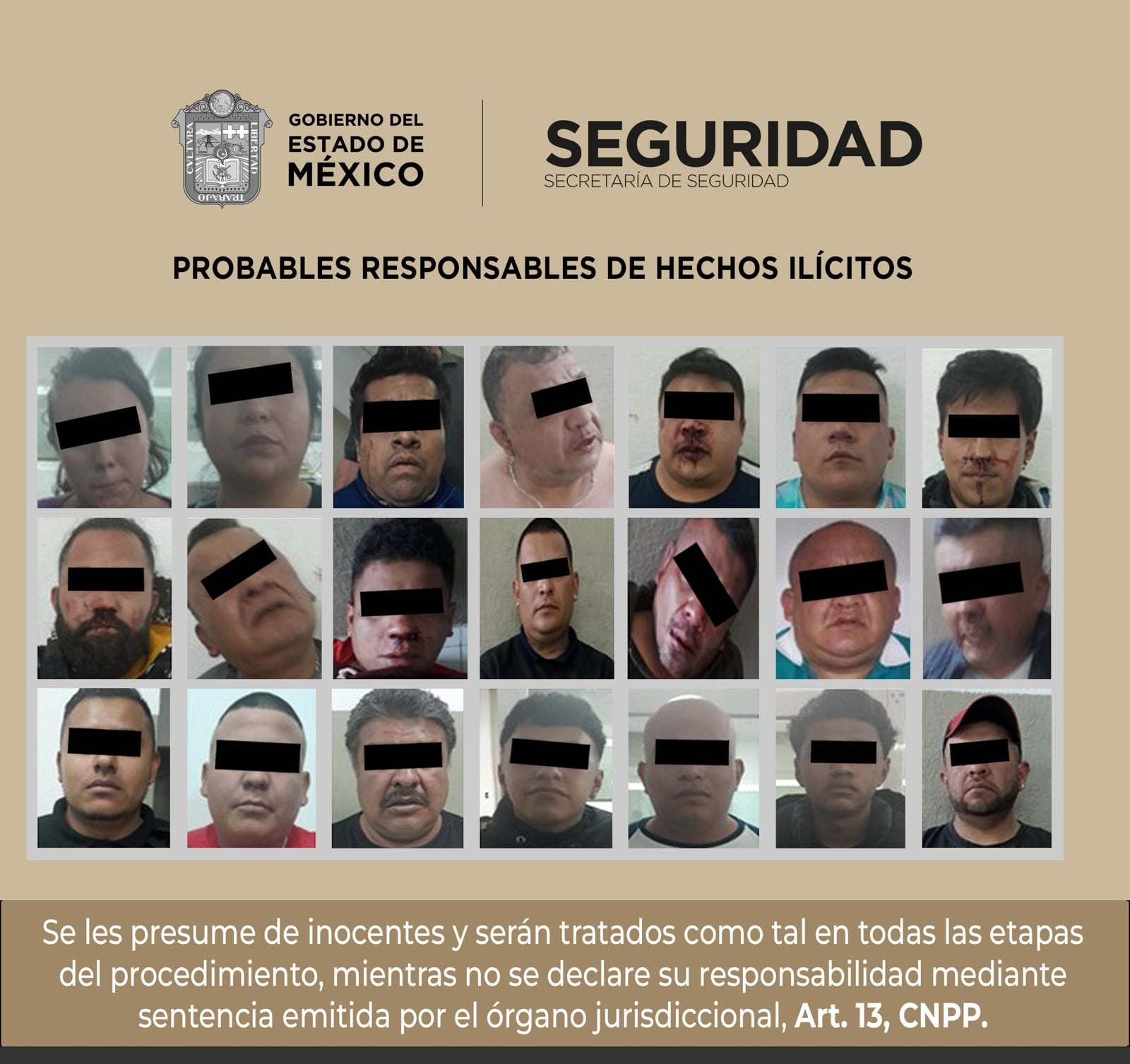 La Secretaría de Seguridad del Estado de México (SSEM) y la Policía Municipal detuvieron a 21 integrantes de la Organización Resistencia Civil Pacífica, por su probable participación en diversos delitos, entre los cuales se encuentran despojo, robo, portación y acopio de armas de fuego y armas blancas, así como lesiones.