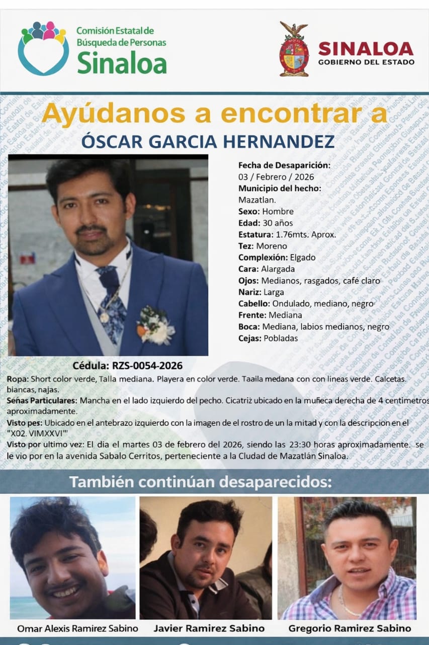 Óscar García es maestro de Educación Física y, de acuerdo con su hermana, la familia mantiene la expectativa de que se estén desplegando los operativos correspondientes para organizar una búsqueda más amplia que permita dar con su paradero.Adriana indicó que, de ser necesario, los familiares se trasladarán a Mazatlán para mantenerse atentos al desarrollo de las investigaciones y acompañar de cerca el proceso.