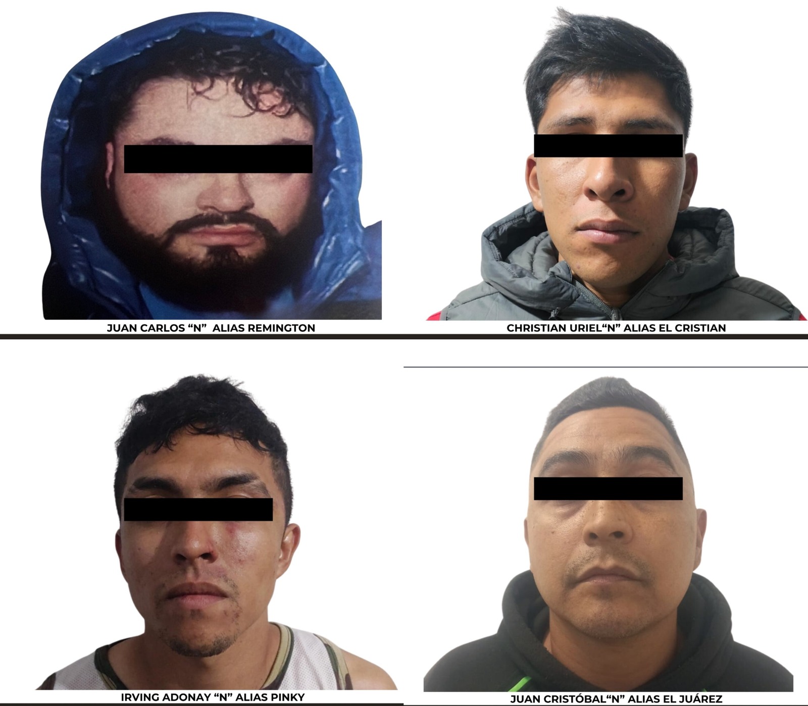 Cabe mencionar que Juan Cristóbal “N” alias “Juárez”, Christian Uriel “N”, alias “El Cristian”, e Irvin Adonay “N” alias “Pinky”, también fueron vinculados a proceso por el ilícito de secuestro con la agravante de causar la muerte en agravio de seis personas, cuyos restos fueron hallados calcinados el pasado 8 de octubre en el municipio de Jilotepec. En tanto que alias “Remington”, enfrenta proceso legal por los ilícitos de delitos contra la salud y posesión de cartuchos de armas exclusivas para el ejército.