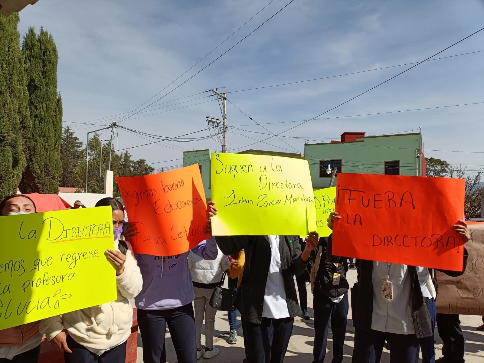 En otros carteles mostraron mensajes exigiendo la destitución como directora de Leticia Zarco Mendoza, señalado malos tratos hacia los estudiantes.