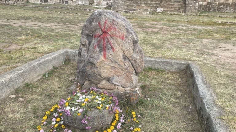 Además del texto, que decía “Fuera Osvaldo”, en una piedra que es parte del patrimonio arqueológico de la zona, fue pintado un asterisco, al parecer también con pintura en aerosol.