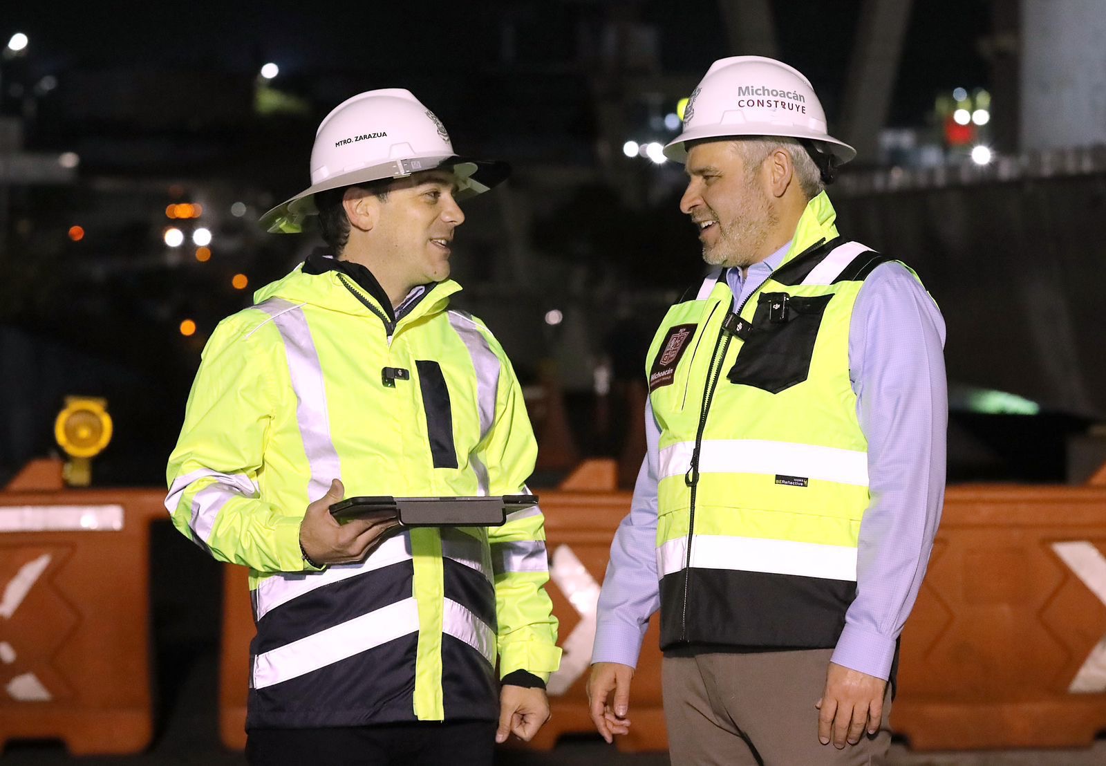 El gobernador Alfredo Ramírez y el secretario de Comunicaciones y Obras Públicas, Rogelio Zarazúa Sánchez, supervisaron la instalación de la segunda trabe de nueve en total que integrarán el puente Periférico-Calzada La Huerta, del distribuidor vial de la salida a Pátzcuaro.