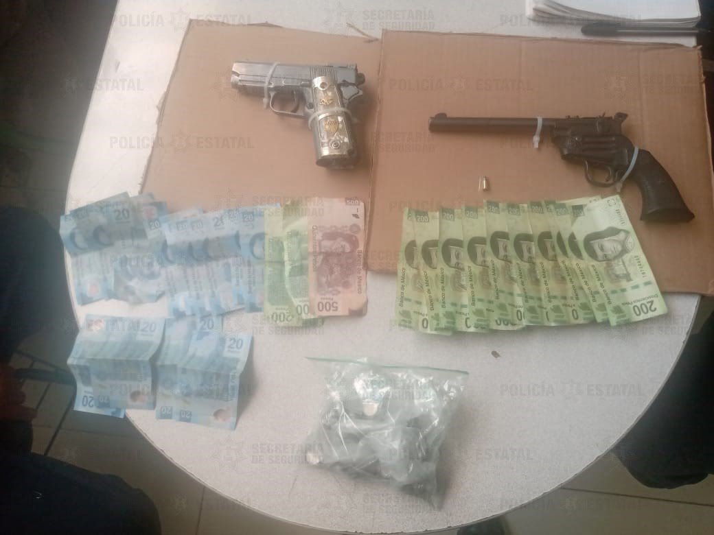 A fin de brindar apoyo, efectivos de la SS se sumaron a la persecución logrando la captura de Pedro “N” y Jorge “N”, a quienes se les realizó una revisión protocolaria; al concluir, se aseguraron dos armas de fuego; una tipo revólver calibre 4.5 milímetros y otra deportiva con cachas, así como un cartucho útil calibre 22; además, se recuperó la cantidad de 3 mil 260 pesos en efectivo, reportados por la víctima.
