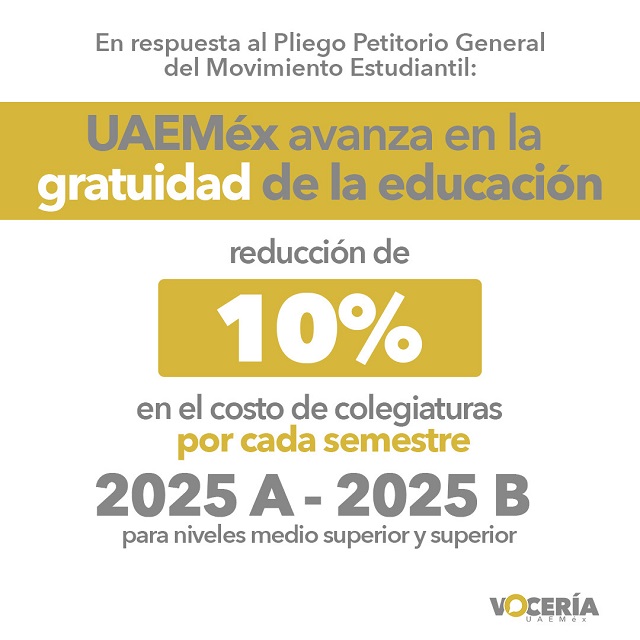 Bajo este contexto, la Máxima Casa de Estudios mexiquense con el firme compromiso de implementar este mandato, aplicará 10 por ciento de descuento a la colegiatura que corresponde al semestre otoño 2025, el cual comenzará en agosto próximo. Este descuento se suma al 10 por ciento que se aplicó en el semestre primavera 2025.